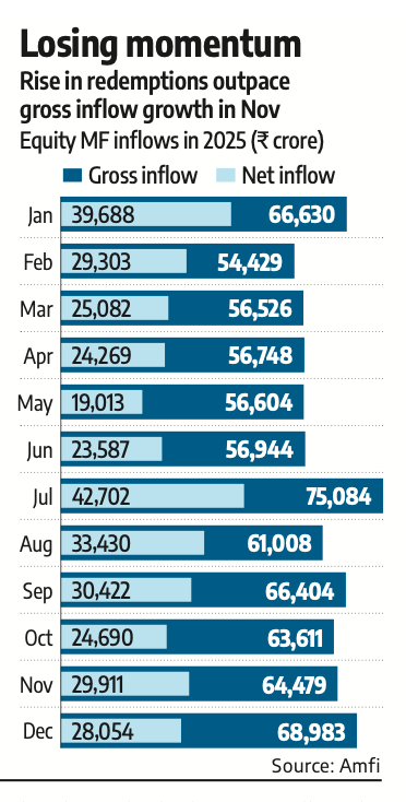 Net inflows into equity mutual funds declined 6% month-on-month to ₹28,054 crore in December. Although gross inflows increased 7% to ₹68,983 crore, redemptions surged 18% to nearly ₹41,000 crore, the highest in 17 months, dragging down net inflows.