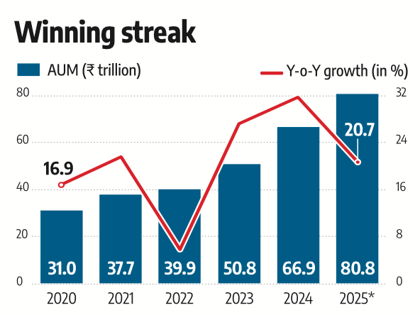 The Indian mutual fund industry is expected to record over 20% growth in Assets Under Management (AUM) for the third consecutive year in 2025. AUM increased from ₹66.9 trillion at the start of the year to ₹80.8 trillion by the end of November, according to AMFI data.